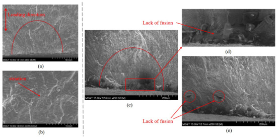Fracture surface analysis of fine finished wrought and SLM fabricated materials, (a) crack nucleation site; and (b) crack propagation site of a wrought specimen, the nominal stress is 411.67 MPa; (c) crack nucleation site of SLM fabricated specimen, the nominal stress is 394.76 MPa; (d) presence of lack of fusion at the surface initiating the crack; (e) presence of lack of fusion within the volume enhancing crack propagation rate.