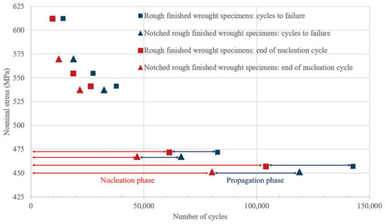 Nucleation and propagation phase of rough finished wrought and notched rough finished wrought specimens.