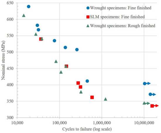 The Wohler curve for fine finished and rough finished wrought specimens, and fine finished SLM specimens was plotted as shown in Figure 17. Both fine finished SLM and rough finished wrought materials exhibit low fatigue strength compared to the fine finished wrought material. The endurance limit of the fine finished, rough finished wrought specimen and fine finished SLM specimen reported here are , and MPa respectively. The yield tensile strength (YTS) and ultimate tensile strength (UTS) for the wrought material used in this study are and respectively while for the SLM material with the same process parameter used, they are and MPa respectively [47]. These results are in good agreement with the general relationship between fatigue limit and ultimate tensile strength [43]. The endurance limit is also comparable with the results reported by other authors [38,48].