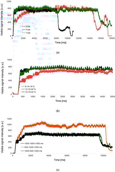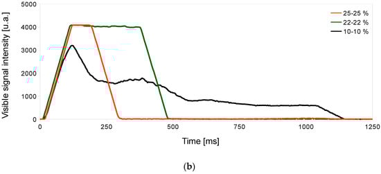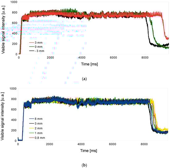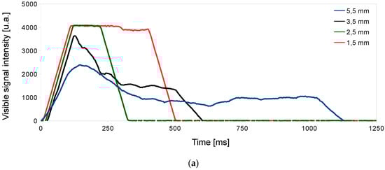 The influence of the programmed parameters in soft piercing processes of mild steel was studied, observing the visible signal intensity and, consequently, the vapor plume formation. It was observed that the signal value remained constant with the focal position and standoff variations (Figure 2; however, it varied for the rest of the parameters (Figure 3). Monitoring results showed that the vapor plume formation depended on parameters directly related to laser power, such as duties or ramp time, or on the material ejection produced by the gas. The selected pressure mainly affected the beginning of the process, which had a lower signal with less gas pressure due to less material evacuation and, finally, matching the signal value as the process continued and the vapor plume formation became steady. As the duties increased, the value of the monitored visible signal also increased, while from achieving a given value (20) the same signal intensity was always obtained. It was also observed that the ramp time of the first piercing affected the intensity of the signal. However, starting from a similar first piercing, the ramp time of the second piercing did not affect the intensity of the signal. The same explanation as for pressure could be applied for these last two studies, attributing the initial variation of signal intensity to the plume formation and, afterward, the obtaining of a fixed intensity value to its saturation. Figure 3b,c showed lower signal intensities for 8-14-18 duties percentages, and 1000-1000-1000 and 1000-500-1000 ramp times, respectively. In these cases, process conditions were softer and, thus, the plume remained constant without saturating.