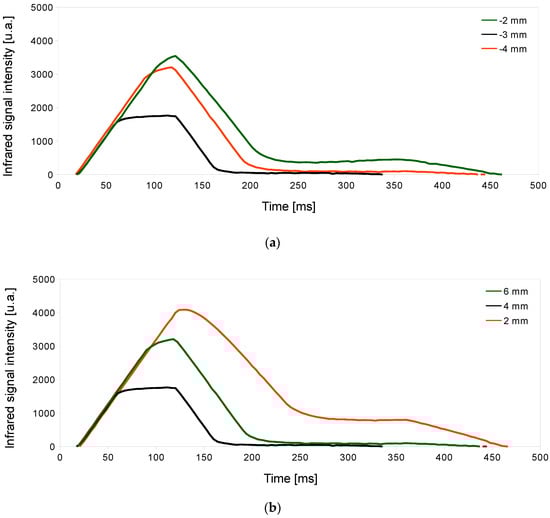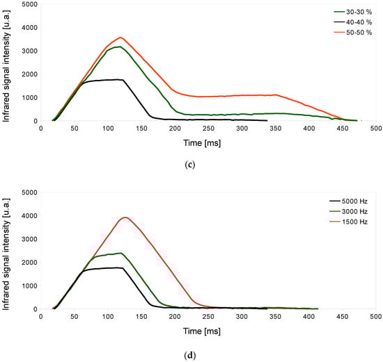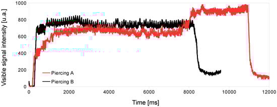 In the case of stainless steel (Figure 4), the infrared monitored signal of ideal process conditions (black line) always gave off a lower intensity than the non-ideal ones. In this sense, and relating infrared signal and temperature, it could be explained that good piercing conditions generated lower intensity due to a lower temperature, thanks to having a minimum heating in the piercing zone.