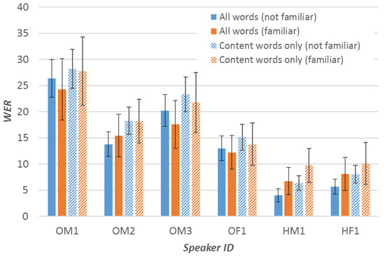 As can be seen in Figure 1, the mean ‘content words only WERs’ and ‘All words WERs’ differ in value, but only by a small number (mean value of 2.73 percentage points). The ‘content words only WERs’ were highly correlated with the ‘All words WERs’ (Pearson’s r = 0.889, p < 0.001 ). Therefore, we can see that the trend of the nonpatterned bars and the patterned bars is similar.