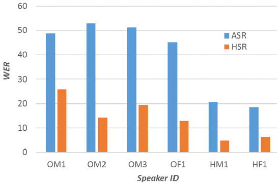 Finally, we present speakerwise average ASR WERs of the 30 sentences and compare them with the HSR WERs.