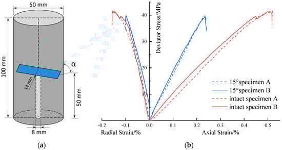 In order to evaluate the consistency of specimen preparation, two of the intact specimens and 15° specimens were randomly selected for a conventional triaxial test under confining pressure of 2 MPa and 6 MPa, respectively. As the stress–strain curves show in Figure 1b, the dispersion degrees of peak deviator stress, peak axial strain, peak annular strain, and elastic modulus were within 1.5%, indicating that these specimens have a good consistency.