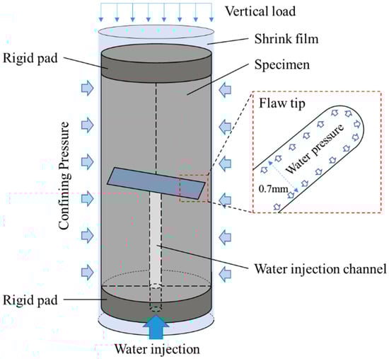 A uniaxial compression test, triaxial compression test, and hydraulic coupled triaxial test were conducted in this paper. The hydraulic coupled triaxial test was a triaxial compression test with water injected inside the specimen through a water injection channel simultaneously inside the pressure chamber, so that the flaw surface was filled with water pressure (this can be seen as the loading condition in Figure 2). The entire experiment was conducted in the Key Laboratory of Geotechnical and Underground Engineering at the Ministry of Education, Tongji University, Shanghai 200092, China.
