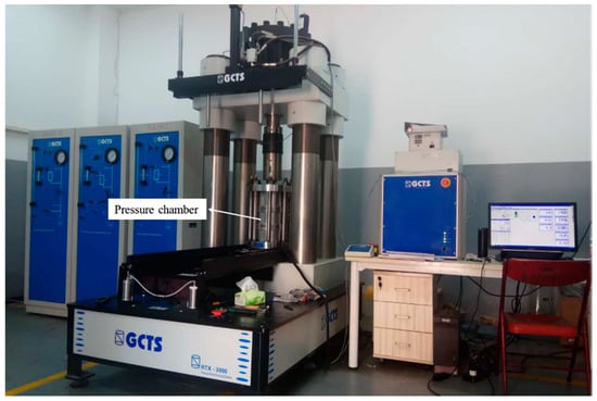 The uniaxial compression test adopted a 300 kN rock mechanics servo pressure testing machine, which was made by Shanghai Hualong Test Instruments Co., LTD. The loading carried out with 0.02 mm/s until specimen failure. The conventional triaxial test and hydraulic coupled triaxial test were conducted using a GCTS RTX-3000 triaxial rock testing system (Figure 3). The RTX-3000 consists of a hydraulic station, a loading rack, a pressure chamber and a confining pressure and pore pressure supercharger, high-precision sensors, a microprocessor, and an analysis system. During the test, the axial stress was applied by a piston mounted, the confining pressure was applied by the confining fluid (silicone oil) in the pressure chamber, and the water pressure was applied by the pore pressure supercharger through the water injection channel.
