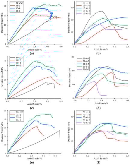 Part of stress–strain curves as an example. (a) 15° specimens in uniaxial and triaxial compression tests; (b) 15° specimens in hydraulic coupled triaxial tests; (c) 60° specimens in uniaxial and triaxial compression tests; (d) 60° specimens in hydraulic coupled triaxial tests; (e) 75° specimens in uniaxial and triaxial compression tests; (f) 75° specimens in hydraulic coupled triaxial tests.
