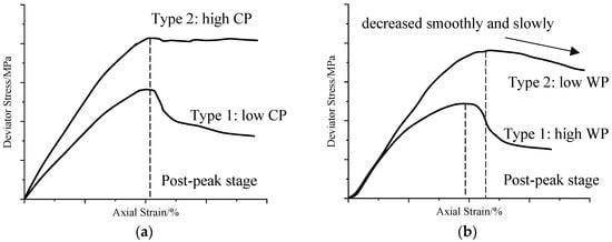Sketch diagram of stress–strain curve types in triaxial tests. (a) Triaxial compression test; (b) hydraulic coupled triaxial test.