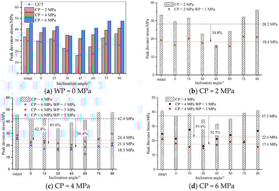 The peak deviator stress is the highest value of the stress–strain curve and equal to the triaxial compression strength minus the confining pressure value. Figure 6 shows the peak deviator stress of the specimens under different confining pressure, water pressure, and flaw inclination angle. As shown in Figure 6a, the strength increased with the confining pressure only, except for the 30-6 specimen. In the hydraulic coupled triaxial test, the strength was much lower than that of the triaxial compression test (Figure 6b–d). The dotted line shows the average strength under the same conditions. It can be seen whether the confining pressure (CP) was 2 MPa, 4 MPa or 6 MPa; the peak deviator stress decreased with the increase of water pressure (WP). That indicates the water pressure greatly reduced the strength, in other words, water pressure promoted the failure trend of the specimens. This means that rock mass in a stable state can be destabilized by the injection of water.