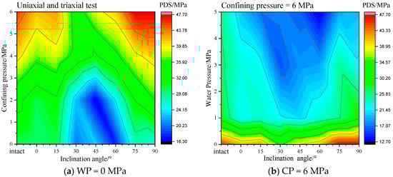 Figure 7 shows the linear fitted contour map of peak deviator stress; different colors indicate the magnitude of peak deviator stress. It can be seen that the confining pressure increased the peak deviator stress and water pressure weakened it. When the inclination angle was between 30° and 60°, the strength was the smallest, while the strength of 0° and 90° specimens was the largest and most similar to that of intact specimens. It is worth noting that the 15° flaw inclination angle interval is still relatively large and this trend needs further research.