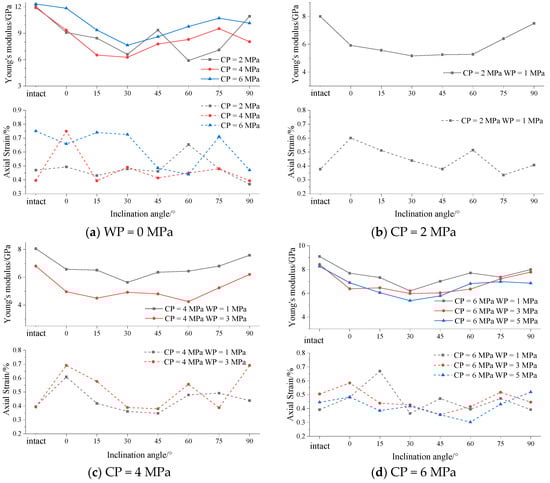 The results of Young’s modulus and the axial strain at peak deviator stress are shown in Figure 8. In the triaxial compression test, there was no significant trend of peak axial strain under 4 MPa and 2 MPa confining pressure, while under 6 MPa confining pressure the peak strain increased significantly, except for 45° and 60° specimens. A possible explanation for this might be that the failure mode of the specimens under 6 MPa confining pressure was transformed into ductile failure, and the stress–strain curve behaved like type 2 in Figure 5a, which had a long yield platform so the peak axial strain increased. As shown in Figure 8b–d, both the intact specimens and the jointed specimens were weakened by water pressure in the hydraulic coupled triaxial test. Despite the discreteness, it can still be seen that Young’s modulus increased with confining pressure and decreased with water pressure.