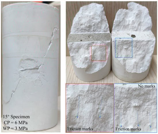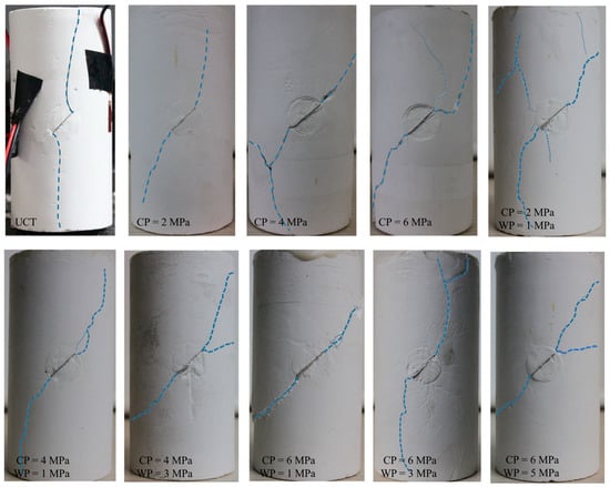 For brevity, Figure 9 is an example to illustrate the application of surface crack observation in this paper. As shown in Figure 9, the 45° specimens showed typical wing cracks and distinct tensile characteristics under uniaxial loading. In the triaxial compression test, the cracks changed significantly with the increasing confining pressure. In the hydraulic coupled triaxial test, cracks were affected by coupled confining pressure and water pressure. A fragment of wing crack was observed in 45-2-1, and the crack geometry of 45-4-1 was very similar to that of 45-2; they all showed geometric characteristics of tensile crack, as shown in Figure 9. Under the confining pressure of 2 MPa and 4 MPa, the 1 MPa water pressure enhanced the tensile failure characteristics of the specimens. When the confining pressure was 6 MPa and water pressure was 1 MPa, the crack geometry showed typical shear characteristics with a slip plane. When water pressure increases, the failure mode changes. In 45-6-5 and 45-4-3, horizontal coupled cracks (HCCs) were found. The HCCs were also observed in 15-6-5 and 30-6-5, and previous studies showed the HCCs were different from any tensile wing cracks, shear cracks, secondary cracks or anti-wing cracks. Please refer to Zhou [] for a detailed study of HCCs.