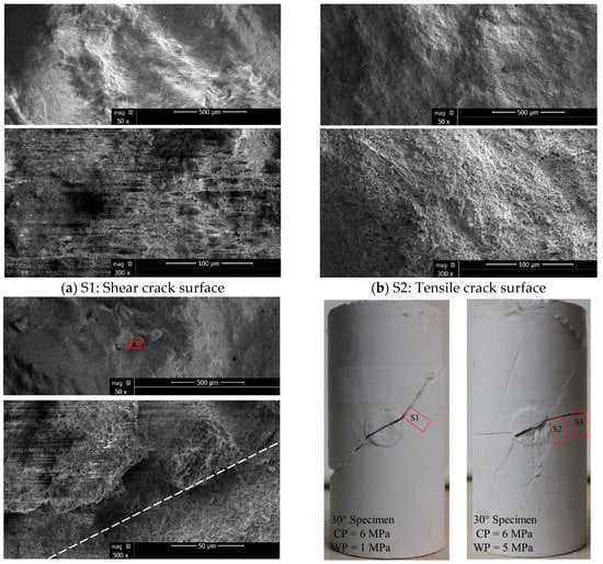 As shown in Figure 12a, at 50× magnification, sliding traces can be seen on the crack surface in most of the field; the stripes indicate that the crack has undergone intense shearing. In Figure 12b, no such shear traces were observed at either 50 or 300× magnification. Even the authors searched higher magnification, but only a jumble of gypsum crystals was seen. Then the authors observed several scanning samples taken from the initial segment of the HCC. By moving the position of scanning samples under SEM to cover the whole scanning surface, no evidence of shear cracks was observed. This suggests that HCCs were formed by tensile stress. However, the characteristics of mixed cracks were observed in scanning samples taken from the ends of HCCs. Scanning sample S3 in Figure 12c is an example; no significant features can be seen at lower multiples, while mixed shear traces can be observed with the increase of magnification multiples. As shown in the red box, obvious tensile-shear mixed characteristics can be observed at 500× magnification. The upper left part of the white dotted line was dominated by shear failure, while the lower right part was dominated by tensile failure, and this feature can also be observed elsewhere in S3. This indicates that the crack in S3 was subjected to tensile-shear mixed effect. In fact, by further microscopic observation in other scanning samples, we found that many of them were not simply tensile or shear. However, even in the case of mixed failure, the main properties can be distinguished by the magnitude of shear characteristics under SEM. The microscope observation showed HCCs were tensile cracks when they just initiated from the outer tips of the pre-existing flaw, and tensile failure was dominant during the whole fracturing processes, while the HCCs became tensile and shear mixed cracks when the specimens were about to fail.