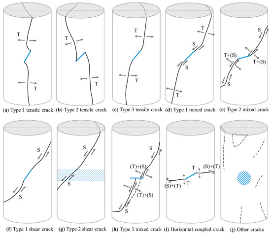 Based on the macro and micro observation method, the author summarized the crack types observed in this experiment. Figure 13 shows the schematic diagram of different types of cracks that led the jointed specimen failure, including three kinds of tensile cracks, two kinds of shear cracks, three kinds of mixed cracks, and a horizontal coupled crack (HCC).