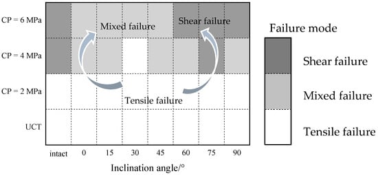 Based on geometries and propagation mechanisms, the main crack types that led the specimen failure was obtained. Table 2 shows the main crack types observed in uniaxial and triaxial compression tests. The letters in the table correspond to different crack types in Figure 12. According to the results in Table 2, the failure modes of specimens were obtained. Figure 14 shows the heat maps use colors as a way to distinguish different failure modes; each grid represents a test condition.