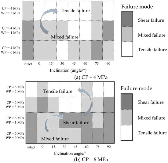 Figure 15 shows the heat maps of failure mode under 4 MPa and 6 MPa, respectively. When the confining pressure was 4 MPa (Figure 15a), the failure mode of the specimens changed from mixed failure to tensile failure as the water pressure increased. However, when the confining pressure was 6 MPa (Figure 15b), the shear characteristics of the specimens under 1 MPa water pressure were stronger than those of specimens in the conventional triaxial test, and the specimens changed from mixed failure to shear failure. With the further increase in water pressure, the observation results showed that water pressure significantly promoted the tensile failure of the specimens. Macroscopic and microscopic observations showed that 1 MPa water pressure made the specimens more prone to shear failure. It is possible that the lubrication of water reduced the resistance of the potential sliding surface, and the effect of this lubrication exceeds the effect of hydraulic pressure expansion force under 6 MPa confining pressure. When water pressure increased, tensile cracks were observed, and the results showed that specimens were prone to tensile failure. It seems like tensile cracks were more “easy” to initiation and propagation under high water pressure, possibly because of the expansion force exerted by water pressure.