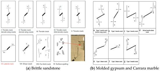 Various crack types obtained by scholars. (a) Brittle sandstone specimens by Yang and Jing []; (b) molded gypsum and Carrara marble specimens by Wong and Einstein [,].
