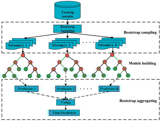 Random forest (RF) is an ensemble machine learning method, which consists of multiple uncorrelated decision trees. It is widely used in image classification tasks due to its high accuracy, easy parameterization and robustness against overfitting [30]. Figure 3 illustrates how the random forest model works. Given the dataset with N samples , where and denote the input 172 features and the output label of sample l, the general idea of random forest can be described as,