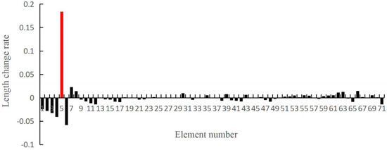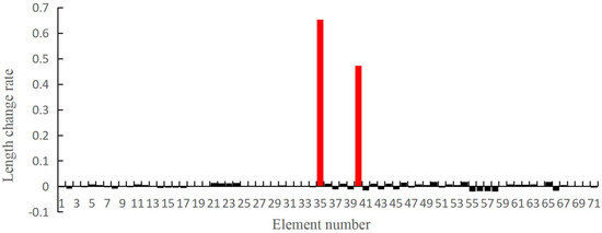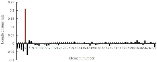As mentioned above, actual static loading may be difficult to perform on the actual engineering structure to obtain the displacement parameters. In such a case, a dynamic test can be used to obtain the modal parameters and the virtual displacement parameters. That is, a method that uses the dynamic flexibility combined with virtual force was adopted to obtain the displacement data indirectly. The results of the rate of length change of the element calculated by this method are shown in Figure 8, Figure 9, Figure 10 and Figure 11.