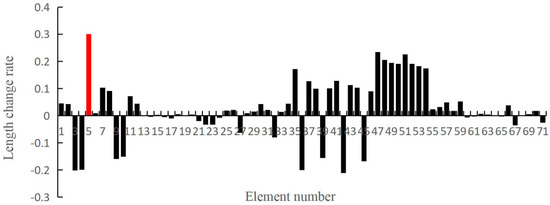 As seen in Figure 8 and Figure 9, in the case of no noise interference, the length change rate of the element obtained from the dynamic data can also determine the damage position of the element in a relatively clear manner. When there was 5% noise interference, as seen in Figure 10 and Figure 11, there was a significant peak at the position of the damaged element, which also indicated that the element with the larger length change rate was most likely to sustain damage. Note that the results obtained from the dynamic data were less accurate than those obtained from the static data. This is because the flexibility matrix obtained by the dynamic flexibility method was an approximation, and the displacement obtained by applying the virtual force based on this was naturally less accurate than that obtained from the direct static test. Therefore, in engineering practice, static conditions are preferred to obtain displacement parameters in order to obtain damage localization results with higher accuracy, when the conditions permit.