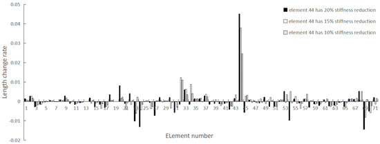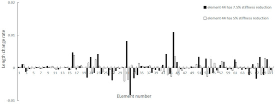 In order to study the sensitivity of the proposed method, Figure 12 and Figure 13 present the results of the elemental length change rates when element 44 (between nodes 12 and 22) was damaged with an added 5% noise. Specifically, Figure 12 gives the results when element 44 has 20%, 15%, and 10% stiffness reductions, and Figure 13 gives the results of 7.5% and 5% stiffness damages. From Figure 12, one can see that there was a significant peak at the damaged element 44, which indicated that the damage position can be determined in a relatively clear manner when the damage degree is more than 10%. The results in Figure 13 are confused, and it was impossible to accurately identify the true damage location, which indicated that the proposed method is ineffective when the damage degree is less than 10%. Obviously, the cause of misjudgment lies in the adverse effect of data noise, because the displacement changes caused by the damage are often submerged by the data noise when the damage degree is very small. For this case, 10% stiffness reduction is the minimum detectable damage.