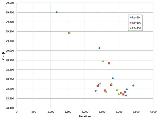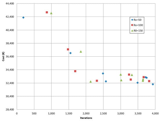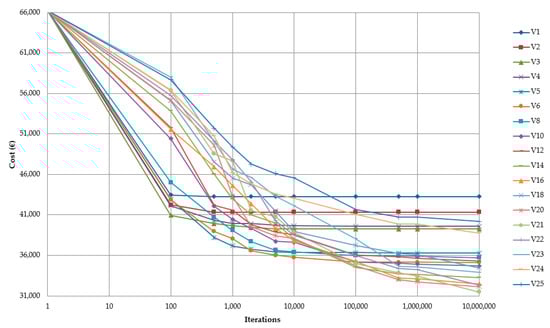 The movements set out in the study modified 1 to 25 variables. The number of iterations used with no improvement were 100, 500, 1000, 2000, 5000, 10,000, 100,000, 500,000, 1 million, and 10 million. Figure 3 shows the average cost values according to the number of iterations stop criteria. With movements of one, two, three, four, and five variables, the algorithm converged very quickly in such a way that improvements were no longer achieved from 500, 5,000, 100,000, and 500,000 iterations, respectively. Movements of more than five variables always improved the results, as the number of iterations increased, starting to converge from 10,000 iterations. The most balanced evolution was given to a movement of five or six variables; given that it converged from 10,000 iterations.