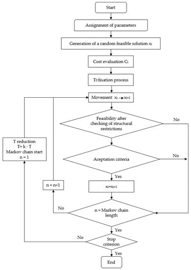 The hybrid simulated annealing (SA) with a mutation operator (SAMO2) is an algorithm developed by Martí et al. [] (Figure 4). This technique is used to combine the advantages of good convergence of SA and the promotion of the diversity of the genetic strategy. SA, developed by Kirkpatrick et al. [], is based on the analogy of the thermodynamic behavior of a set of atoms to form a crystal. “Annealing” is the chemical process of heating and cooling a material in a controlled fashion. Genetic algorithms seek the best solution through operators such as selection, crossover, and mutation. Soke and Bingul [] effectively combined both algorithms. SAMO2 introduces the probabilistic acceptance of poorer quality solutions during the process, allowing it to escape from local optimums and to finally find the highest quality solutions. To do this, it accepts worse solutions with a probability Pa, given by the expression of Glauber (5), where T is now a parameter that decreases with the time, thus reducing the probability of accepting worse solutions, from an initial value, T0: