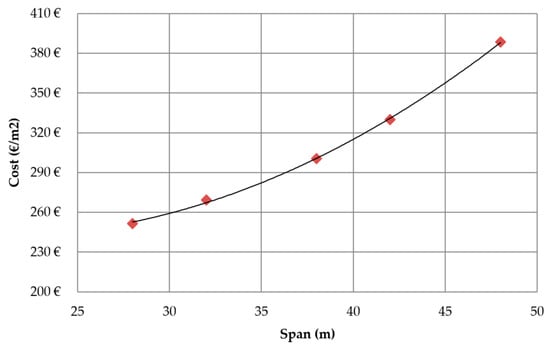 Figure 8 shows the average results of the cost of the structure per square meter of the steel-concrete composite pedestrian bridge for distinct span lengths. The cost evolution as a function of the horizontal span leads to a very good quadratic correlation. The average footbridge cost adjusted to C = 0.1954L2 − 8.0873L + 325.96 with a regression coefficient of R2 = 0.9994. The cost rising is produced by the need for larger amounts of materials to satisfy the deflection requirements. Note that the R2 regression coefficient in Figure 8 is almost 1, this indicates a very good correlation. The variations between the minimum and the mean cost of the pedestrian bridge produced by the GSO and DLS combination are 0.42%.