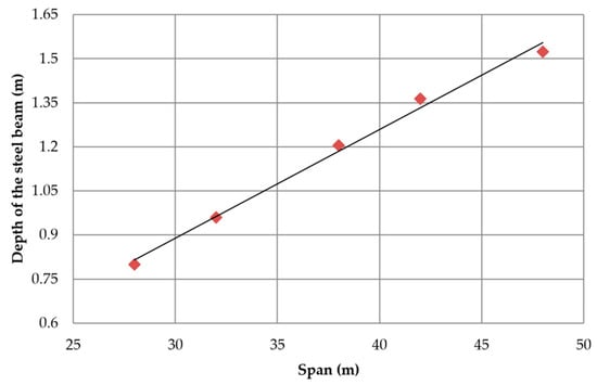Figure 9 shows the mean values of the depth of the steel beam (CA) for different span lengths. The depth of the beam has a good linear variation, according to the span length of the bridge. The average depth of the beam adjusts to CA = 0.0369L − 0.2179 with R2 = 0.9927. Again, the good correlation factor represents a functional relationship.