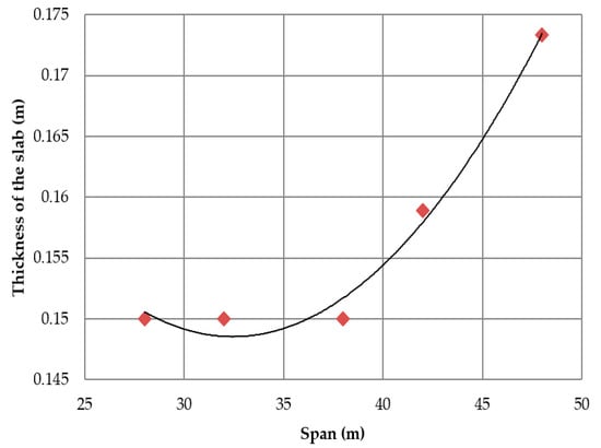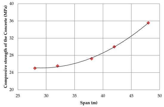 As shown in Figure 10, a function was found relating the thickness of the slab with different span lengths. Up to a certain span length, the slope of the parabola is smaller because the inertia of the slab is determined by the transverse flexion. Once the slab stresses are determined by the longitudinal deflection, the slope of the curve increases. The average slab thickness adjusts to CL = 0.0001L 2 − 0.0067L + 0.2568 with R2 = 0.9849 when the span length is larger than 38 m. Related to the compressive strength of the concrete of the slab, Figure 11 shows the relationship of the concrete compressive characteristic strength and the span length. This relationship adjusts well to a quadratic function. The concrete compressive strength adjusts to FCK = 0.0292L2 − 1.6959L + 49.714 with R2 = 0.9987. Note that the highest concrete compressive strength considered for this study was 35 MPa.