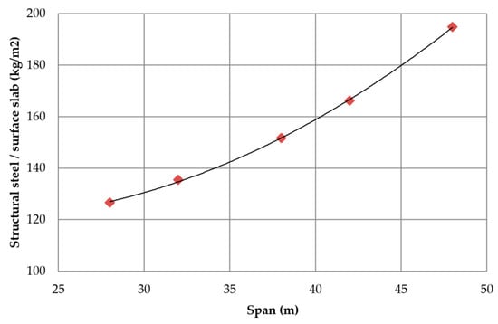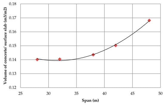 Regarding the ratio of the amount of rolled steel (Rs) and the surface of the slab (Ss) Figure 12 illustrates the increase in the amount of rolled steel needed to resist the flexural requirements. The slope of the curve tends to increase as the span length increases. The mean amount of rolled steel in relation to the surface of slab adjusts to Rs/Ss = 0.01913L2 − 3.5553L + 154.96 with R2 = 0.9996. However, the ratio of the volume of concrete (Vc) and the surface slab fits a second order equation that increases with the span length in the same way as rolled steel amount, as seen in Figure 13. The mean ratio of the volume of concrete in relation to the surface of slab adjusts to Vc/Ss = 0.0001L2 − 0.0067L + 0.245. Moreover, the ratio of reinforcing steel (RFs) measured per square meter of slab shows the same tendency as rolled steel amount and concrete volume. The ratio of reinforced steel in relation to the surface of slab adjusts to RFs/Ss = 0.0246L 2 − 1.2009L + 32.516 with R2 = 0.9955, as shown in Figure 14.