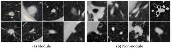 Examples of pulmonary nodules and non-nodules carrying similar structures. Each example is a two-dimensional (2D) transverse plane extracted from the location of the candidate nodule.