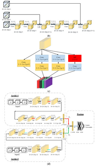 In the data preprocessing stage, we extracted , , and blocks for each sample via the central coordinates of the candidate nodules and used the nearest neighbor interpolation to transform them all into blocks. We used minimum–maximum normalization to ensure the algorithm converged faster by adjusting the data distribution of the sample. The intensities of the blocks were cut to [−1000, 400] Hounsfield units (HU)2 and normalized to [0, 1].