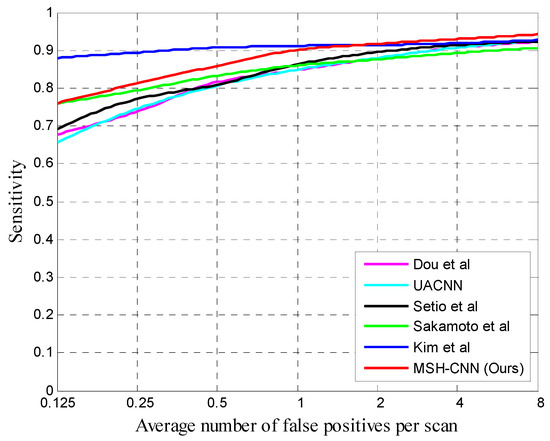 (2) Comparison between MSH-CNN-IC with MSH-CNN. The sensitivity difference between the two structures was smaller than that of other networks. The sensitivity of MSH-CNN-IC was slightly higher than that of MSH-CNN at 0.125 and 1 FP/scan, but the sensitivity of MSH-CNN was high when the FP/scan was other values. This shows that different networks concern different input characteristics, and that a heterogeneous structure is useful.