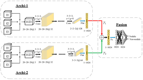 For the I1-I2-I3 (“Input1”) fusion order, the nodule block I1 firstly obtains the feature map F1 via two 3D convolution operations; then, the feature maps F1 and nodule blocks I2 are fused according to channel (shown by the symbol “||”) to obtain F1||I2. After each 3D convolution, the non-linear function ReLU is used as the activation function. The output of ReLU is computed via a batch norm. To ensure that the feature map F1 and the nodule block I2 can be fused according to the channel, we use zero padding to ensure F1 and I2 are equivalent sizes. After combining the channels, F1||I2 also uses two 3D convolution operations to obtain the feature map F12; then, F12 and I3 are fused according to channel (shown by the symbol “||”) to obtain F12||I3, i.e., Input 1. For the fusion order of I3-I2-I1, the same calculation is used, except that the input order of the nodule blocks is reversed.