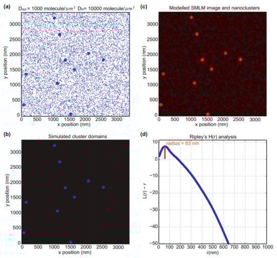 - Shivanandan, A.; Unnikrishnan, J.; Radenovic, A. Accounting for limited detection efficiency and localization precision in cluster analysis in single molecule localization microscopy. PLoS ONE 2015, 10, e0118767. [Google Scholar] [CrossRef] [PubMed]