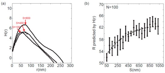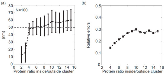 Beyond cluster geometrical parameters, protein density ratio inside/outside cluster also proved to be an important factor influencing the accuracy of peak analysis [16]. To investigate the effects of protein density ratio on the estimation of cluster radius, we varied the protein ratio from 2 to 15 while holding cluster separation constant at 1000 nm and cluster radius constant at 50 nm. The selected Ripley’s H calculations for different ratios are shown in Figure S5. An interesting feature of Ripley’s H calculation is that the maximum of increases as the protein density ratio increases. This phenomenon shows that high degree of protein aggregation inside a cluster is helpful to predict the radius of a cluster. To evaluate the effects statistically, we again counted 100 simulations for each case in Figure 4a. We found that a protein ratio threshold of four is essential to validate the cluster analysis by peak analysis. Under this value, it is difficult for the peak analysis method to identify the protein clustering. Moreover, as the protein ratio value varies from 5 to 11, the SD monotonically increases, yet after the value of 12, the peak analysis method predicts the cluster radius with nearly stable errors [29].