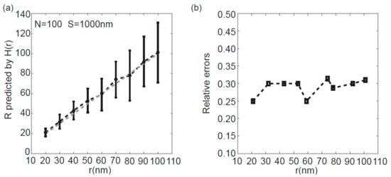 Since the purpose of peak analysis is to predict the average radius of clusters, it is important to study the accuracy of estimation for different sized clusters. As membrane protein clusters are often smaller than 100 nm in diameter [28], we varied the set radius of clusters from 20 nm to 100 nm while holding the cluster separation constant at 1000 nm, for each simulation. Ripley’s H function is calculated in Figure S4. From the estimated radius of the cluster and the standard deviation of 100 point patterns in Figure 3a, we found that the predicted cluster radius by peak analysis (dashed black, n = 100) corresponds well to the actual radius (dashed gray), but the standard deviations (SD) are greatly increased as the radius varies from 20 nm to 100 nm. The major reason for this interesting phenomenon may increase the cluster diameter equivalent to reduction of the ‘buffer zone, bringing more errors in peak analysis. To evaluate further, the relative error defined as the SD over the actual radius is calculated in Figure 3b; we found that the relative errors were always close to 30%. This result is consistent with the above result, up to 1000 nm cluster separation, and we suggest that the peak analysis method may predict the cluster radius within a factor of 1.3 of actual radius. Moreover, these findings suggest that although the relative errors do not depend on the cluster radius, for a large cluster, a single peak analysis may provide an estimated radius with unacceptable errors. To have an accurate prediction of the cluster radius, it is essential to estimate the cluster radius by averaging at least ten from the peak analysis.