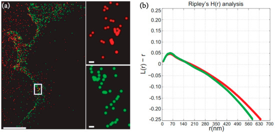Using the uPAINT method (see in Materials and Methods), we measured the EGFR (epidermal growth factor receptor) cluster at COS7 cell surface. Superposed super-resolution images were then reconstructed based on 1000 successive images with a frame rate of 50 ms (Figure 5a). The expanded 1.5 × 2.5 µm2 area observed in different channels is displayed in Figure 5a, separately. The average Ripley’s H(r) plot for the two colored fluorescent detections is displayed in Figure 5b.