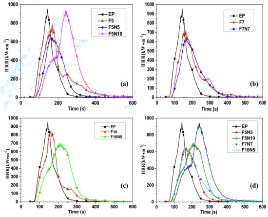 Heat release rate (HRR) of different samples. (a) HRR of epoxy resin (EP), F5, F5N5, and F5N10; (b) EP, F7, and F7N7; (c) EP, F10, and F10N5; and (d) EP, F5N5, F5N10, F7N7, and F10N10.