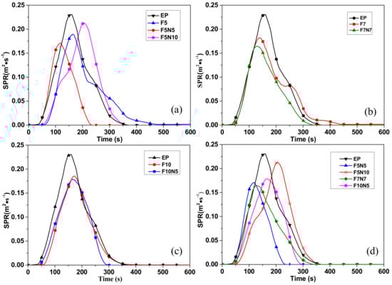 Rate of smoke production (SPR) of different samples. (a) SPR of epoxy resin (EP), F5, F5N5, and F5N10; (b) EP, F7, and F7N7; (c) EP, F10, and F10N5; and (d) EP, F5N5, F5N10, F7N7, and F10N10.