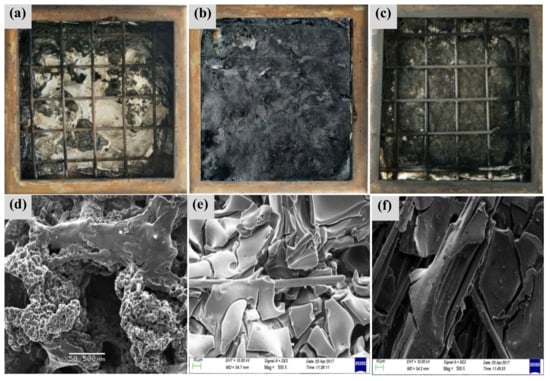 SEM of the combustion products. (a) Morphology of combustion products of EP (b) CF/EP and (c) CNTs/CF/EP. (d) Microstructure of residual carbon of EP, (e) CF/EP, and (f) CNTs/CF/EP composites [26].