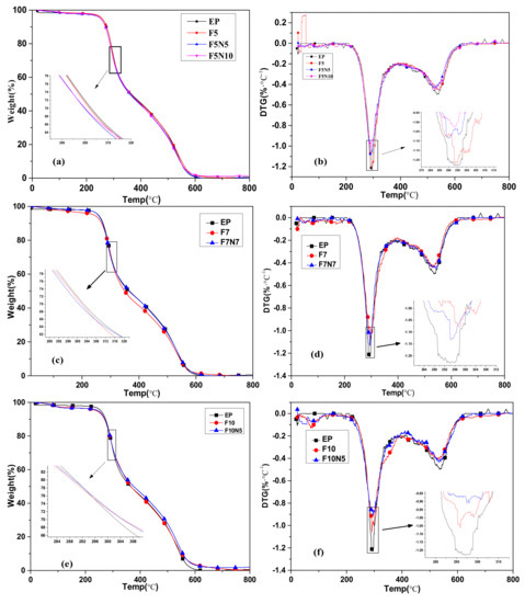The flame retardant effect of the material has been studied above, while the flame retardant effect of the material is often related to its pyrolysis process. In order to study the thermal stability of the material and the effect of the additive on the thermal stability of the material, the samples were heated from 20 °C to 800 °C at a rate of 10 °C·min−1 by a differential thermogravimetric analyzer. The TG curves of EP, F5, F5N5, and F5N10 are included in Figure 4a, and the corresponding DTG curves are shown in Figure 4b. Figure 4c are the TG curves of EP, F7, F7N7, and the corresponding DTG curves are shown in Figure 4d. Figure 4e shows the TG curves of EP, F10, F10N5, and Figure 4f shows the corresponding DTG curves. Six partial enlarged views of vague regions are shown in every figure of Figure 4, which clearly show that there are some differences.