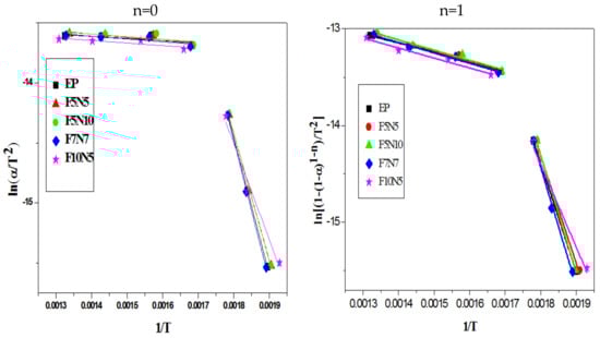 As shown in Figure 5, the pyrolysis curve of the material exhibits two slopes, indicating that the pyrolysis process should include two stages. The first stage is mainly pyrolysis of EP. The main chain of the EP group is decomposed into a volatile gas at a relatively low temperature, and the main chain with a high bonding pressure in EP is broken at the higher temperature, resulting in an increase in mass loss, which corresponds to the first peak of DTG in Figure 4b. The second stage is the residual carbon oxide decomposition in the air atmosphere, which is consistent with the study of Carmen Branca et al. [30,31]. CF and CNTs do not participate in the reaction due to their excellent high-temperature resistance characteristics within the temperature range. The apparent activation energy of the pyrolysis of the material in Table 4 shows that the varying tendency of the apparent activation energy of the material is consistent regardless of the value of n, except that the activation energy of n = 0 is smaller. This shows that the value of n does not have much effect on the thermodynamics of the material. When n = 1, the activation energy of EP in the first stage is 101.0 kJ·mol−1. The apparent activation energy of F7N7 is 2.7 kJ·mol−1 more than EP, while the remaining three-phase composite is reduced. The activation energy of the three-phase composites in the second stage is all higher than EP. This is mainly due to that EP is burned out, while CF and CNTs can protect EP from combustion to an extent. In summary, a certain amount of CNTs and CF can synergistically inhibit the generation of free radicals activated by EP, thereby reducing its pyrolysis.