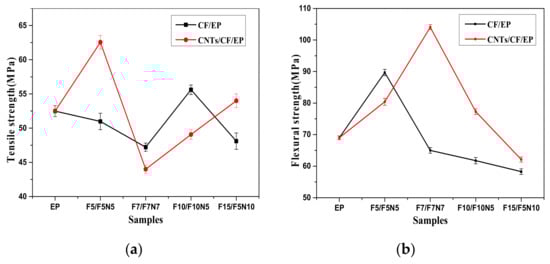 In order to study the effect of the reinforcements on the mechanical properties of the composites, the tensile and flexural strength of different samples were tested by tensile and flexural tests. From Figure 6a, the tensile strength of CF/EP composites decreases first and then increases, and the tensile strength of F10 is the largest, which is 5.9% larger than that of EP. In the three-phase composites, the tensile strength of F5N5 is the largest, which was increased by 19.2% more than the matrix. F7N7 and F10N5 were smaller than the matrix, while it can be found that the tensile strength of the composites gradually increased with the increase of CNTs. This suggests that the addition of CNTs can improve the tensile properties of the material. From Figure 6b, the flexural strength of all materials showed a tendency to rise first and then decrease. In the two-phase system, when the CF was 0.5 wt %, the flexural strength reached 89.69 MPa, while F5N5 and F5N10 were decreased. With the increase of CF, the flexural strength was smaller. The flexural strength of F7 was reduced to 65 MPa, which was smaller than that of the matrix. The flexural strength of F7N7 was the largest and up to 104 MPa, which was improved by 50.7% more than that of EP. Flexural strength of F10N5 was also larger than F10. This indicates that a certain proportion of CNTs and CF can fully exert their mechanical synergistic effects. The reinforcement is mainly dependent on the bond strength of the interface. According to the stress transfer theory, when the composite is subjected to stress, the load is applied to the resin matrix, and then the stress will be transferred to the reinforcement by the matrix through the interface. The reinforcement played a role in the dispersion of force to a certain extent [32]. From the chemical bond theory, the functionalized CNTs can react with the modified CF to produce some kind of bonding through hydroxyl groups and other functional groups. CNTs can react with EP through their epoxy groups to form a three-dimensional network of solidified materials, resulting in an increase in the interfacial bonding strength between the substrate and the reinforcement [33]. The unique nanostructures of CNTs and the high strength of CF are the basis of mechanical enhancement.