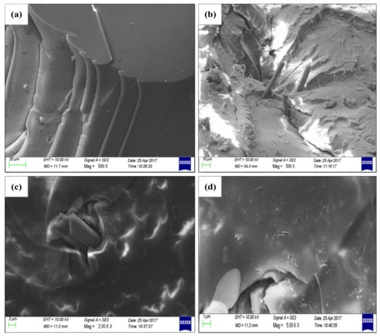 As shown in Figure 7a,b are the mechanical section of EP and CF/EP; Figure 7c,d are the mechanical section of CNTs/CF/EP at the magnification of 2.0 KX and 5.0 KX. As seen in Figure 7a, the cross-section of EP is relatively smooth, and the crack is less and extends in the same direction as the brittle fracture. It can be seen from Figure 7b that, when CF is 1.0 wt %, the carbon fibers dispersed in the resin are lessened. Some holes appear on the fracture surface, which is obviously caused by the desorption of the fiber. It can be seen in Figure 7c that CNTs are dispersed uniformly around the CF and EP except for some white areas which are not clearly scanned. The crack propagates in the direction of the force of CF, which is in line with the stress transfer theory. This demonstrates that CF can enhance the mechanical properties of EP. Since the interface between the fiber and the resin is poor under some certain conditions, the fiber is pulled out to form a hole in the EP. By zooming in (Figure 7c), the distribution of CNTs can be seen in Figure 7d. It can be seen that the CNTs are extracted in the crack, that is, CNTs act as a stress transfer in the process of forming the crack to further dispersing the stress acting on EP. It is the synergy between micron and nanoscale that further enhances the mechanical properties of EP.