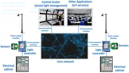 The most general architecture of a smart public lighting infrastructure is shown in Figure 1, which outlines all the main components, namely, the Control Center, the communication network (the core network in Figure 1) and the light controller (LC).