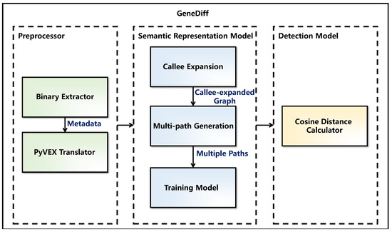 In GeneDiff’s preprocessor, GeneDiff uses a binary extractor to extract data from binaries, including architecture types, compilers, call graphs (callers and callees), function information, basic blocks and assembly code. Then, the assembly code is converted into a VEX intermediate representation by a PyVEX translator at the function level. To address the out-of-vocabulary (OOV) issue, GeneDiff also abstracts some low-frequency (possibly single-occurrence) words in the preprocessor.