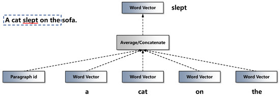 For example, given a text paragraph that contains many sentences, reference [17] utilized PV-DM to predict a center word from the context words and a paragraph id. Figure 4 details the method. As shown in Figure 4, given a paragraph p from a document D and given a sentence s, with the words “A cat slept on the sofa”, the model utilizes a sliding window to address the words in the sentence. The sliding window, with a size of k, starts from the beginning of the sentence and slides forward the end. The sliding window in Figure 4 contains “a”, “cat”, “slept”, “on” and “the”. The model would learn to predict the target word “slept”, which is in the middle of the sliding window.