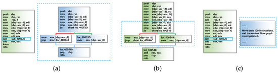Figure 5. Examples of calling a function. (a) An example of calling a function normally; (b) an example of calling a function using inlining; (c) an example of calling a function that possesses more than 100 instructions and whose control flow graph is complicated.